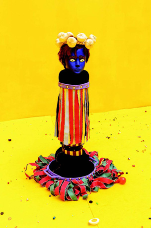 Dans sa pratique artistique, Clément Courgeon jongle avec des médiums, thèmes et couleurs variés. Le caractère explosif et incontrôlable du Carnaval ainsi que sa nature trompeuse où le déguisement est de mise, forment une dualité qui inspire l’artiste. Ce dernier explore ce moment de renversement à travers ses performances qui sont enrichies par ses installations, dessins, costumes et accessoires. La conception de traditions et de cérémonies constituent également une autre de ses