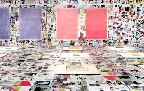 Grande Odalisque, 2020, Peinture, installation éphémère, gouache et spray sur panneaux extraits des murs d’atelier, tasseaux, 195 x 300 cm