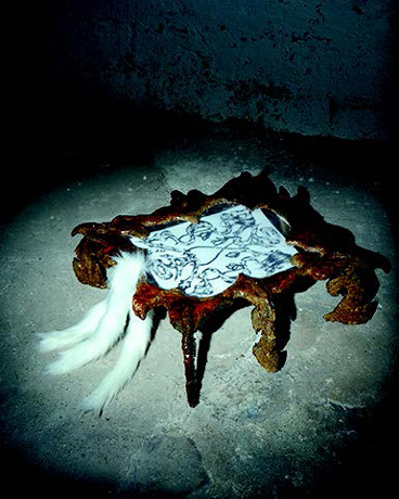 Prospective Paresseuse, 2021, Bois, peinture, fer, céramique, bijoux, coquillages, sérum physiologique, latex, cheveux, terre, plantes, mues de serpent, mouches, araignées, bâche.