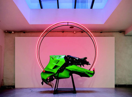 Love Like a Sunset, 2020, Kawasaki 1000 RX, acier, led, 180 x 90 x 250 cm, Production : Le Port Des Créateurs, Vue d’exposition : Galerie l’axolotl, Toulon