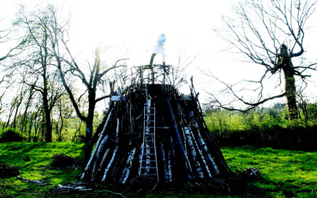 Mise à feu, mise au monde : la tour en argile grise, 2021, fime, 44’15, Vue de l’installation évolutive avec matériaux trouvés sur place : argile grise, bouleau, charme, séquoia, paille, planches, briques, 460 x ø 700 cm, L’archipel du DomaineM, La Motte-Leyrat