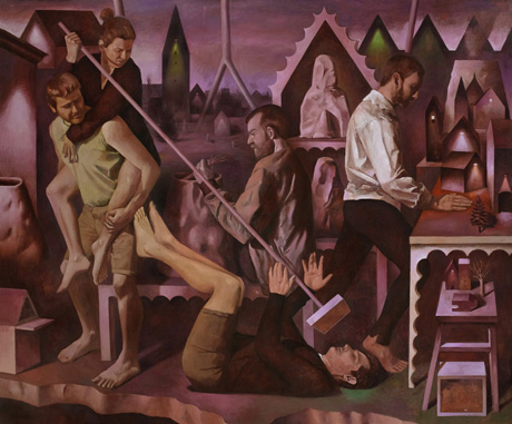 Sergio Morabito, très fortement inspiré par les primitifs italiens, revendique dans son travail une narration interne, une théâtralité et un questionnement sur les registres de langages esthétiques, composant une identité singulière. Sa maniera est celle du secret. Gardant le silence sur les significations de sa peinture, il sculpte des sujets qui se dévoilent peu à peu et résonnent ensemble, du diptyque avec prédelle à la sculpture centrale en passant par les deux prie-dieu sur lesquels le public est invité à s’installer. Ces derniers laissent place à une réflexion introspective plutôt qu’à une dévotion liturgique privée. La religiosité apparente des motifs – dans les postures, dans les formes, dans les objets rituels – est à recevoir comme une relecture mythologique contemporaine, qui s’adresse directement à notre entendement par l’intermédiaire de nos sensations. En devenant le conteur des saynètes, le spectateur résout ses conflits intérieurs entre pulsions animales et comportements sociaux.