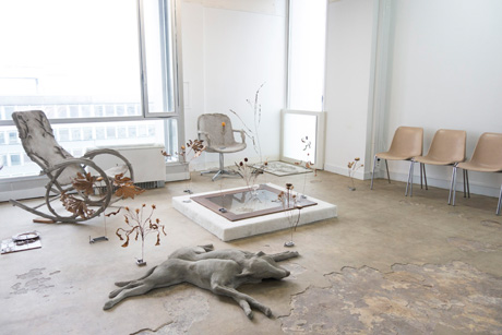 Dès sa première visite en ce lieu, Adrien Menu a souhaité exposer dans cet espace transitoire de la Chaufferie. Ses nouvelles œuvres en épousent l’aspect passager, de par la précarité des objets représentés semblant y avoir été abandonnées, couche après couche, à l’image de ses vêtements entassés sur la rambarde de l’escalier. Seule une démarche ralentie et un regard attentif permet de percevoir la méticulosité des agencements ainsi que les transformations matérielles opérées par l’artiste, jusque dans les détails de cette mouche reproduit en laiton et fixé sur une vitre. Ces corps indésirables, d’apparence mobiles, sont désormais lestés de matériaux bien plus lourds et paraissent s’enraciner dans l’espace. Il semble ici déposer des ancres afin d’introduire une temporalité en contrepoids de cette société rythmé et rythmant l’individu au travers de diktats extérieurs devenus obsolètes.