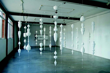 Mantras, 2013-2020, Polystyrène extrudé, cordes en nylon, lests en fer blanc, douche sonore, Dimensions variables