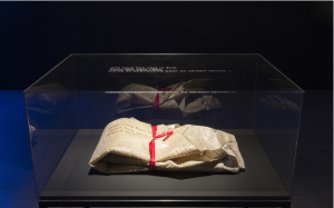 Dans l’atelier de son père, l’artiste a retrouvé des voiles rapiécées, à bout de forces, mémoires matérielles des vents et marées qu’elles ont sillonnées, qu’il présente ici sous vitrines comme dans un musée. À leur surface, l’ombre projetée d’un texte / poème – trace d’une action de pliage réalisée sur la plage avant leur remisage à l’atelier. Ces vestiges archéologiques convoquent plusieurs images : celle du baluchon malmené du voyageur ou du nomade, mais aussi celle du naufrage.