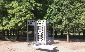 À partir des fragments retirés aux trois grandes plaques du paravent, l’artiste recompose un réel. De cette étape, demeurent les trous vides, comme une invitation à l’introspection et à investir le vide laissé par la disparition de la matière. Pourtant, bien qu’invisible, cette matière est présente : elle permet de construire un mobilier emprunté au design du Bauhaus, à l’esthétique de Mies Van Der Rohe. Ici l’extrêmement sobre lit de repos Barcelona tel le divan de psychanalyse, il devient alors la métaphore des différentes couches du mental, des superpositions de réalités qui participent de la construction d’un réel affirmé. Ce lieu, au milieu du jardin, invite alors à la contemplation, à la suspension du temps.
